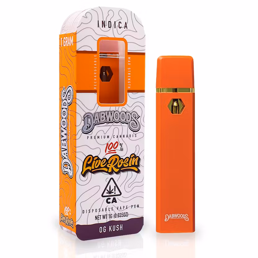 Dabwoods’ OG Kush disposable features live rosin extracted from fresh frozen cannabis flower, using a solventless cold-press method. This process ensures the full preservation of terpenes, cannabinoids, and full-spectrum compounds, delivering a pure, aromatic, and flavorful vaping experience. Unlike distillate vapes, live rosin maintains the natural essence of the strain.